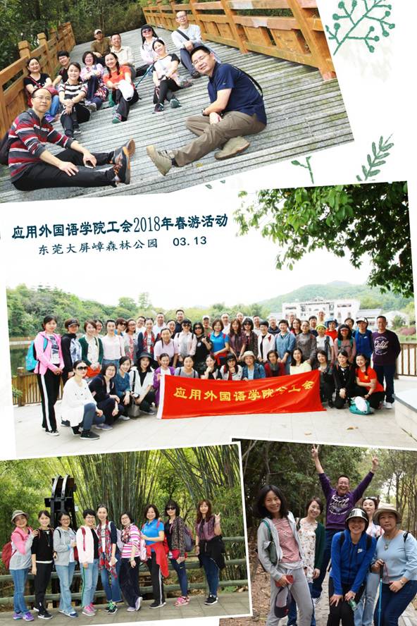 当天午后,阳光明媚,风和日丽,外语分工会教工们来到东莞大屏嶂公园。在如诗如画的花海中,老师们爬山赏景,愉快交谈,拍照留念。完成了漫长陡峭的山路,大家登上顶峰,每个人的额头上都流下了汗水,脸上也洋溢着笑容。“岁岁春草生,踏青二三月,”春天既不像绿树成荫的夏天那么迷人;也不像五颜六色的秋天那么绚烂;更不像银装素裹的冬天那么纯净;但是,它有着无与伦比的生机。